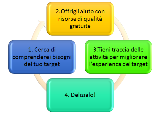 Questo è il processo dell’Inbound Marketing estremamente semplificato. La parte più importante e che spesso viene sottovalutata è l’ultimo gradino: Deliziare il target. Infatti, il processo non termina quando il target raggiunge i contenuti e tu ottieni i contatti (email, numero telefono etc.), ma devi riuscire a stabilire una relazione a lungo termine. Deliziando il tuo target, non solo lo conquisterai, ma contribuirai anche al passaparola: perché sarà il tuo target a condividere i tuoi contenuti e così tu acquisirai più followers di conseguenza.